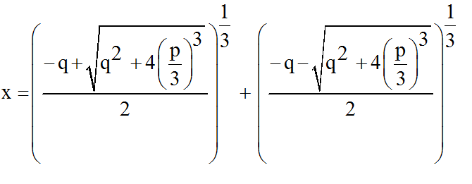 x = [ ( − q + √( q2 + 4 (p / 3 )3 ) ) / 2) ] (1 / 3 ) + [ ( − q − √( q2 + 4 (p / 3 )3 ) ) / 2) ] (1 / 3 )